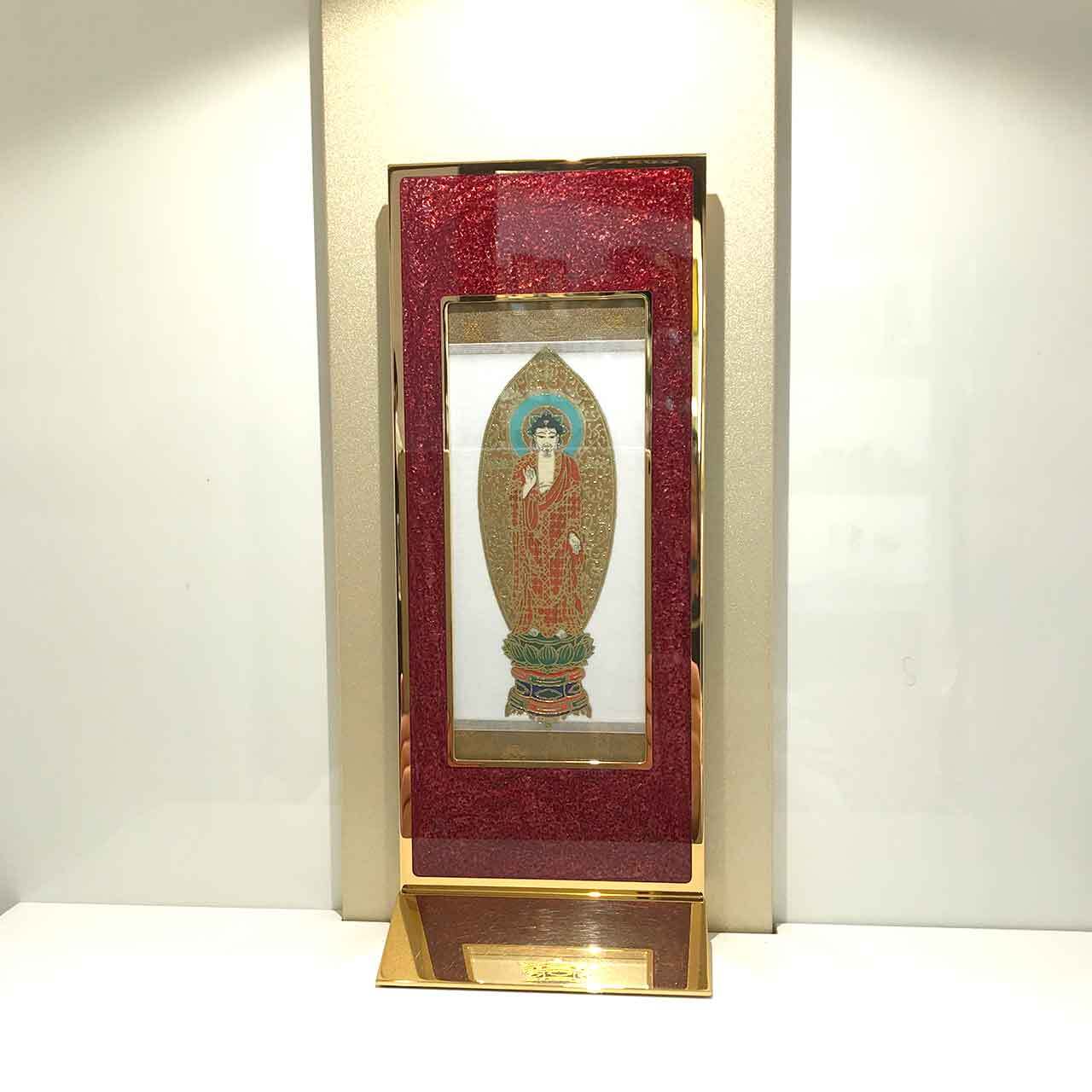 漆宝(漆塗と七宝焼を組み入れた新しい技法)を施したフレームです。シルクスクリーンで手刷りされた御本尊は、一つひとつ丹念にグラデーションや華やかな手彩色を施しました。スタンド型なので、留め具を使わずそのままご使用いただけます。こちらの商品は、御本尊一幅での販売となります。